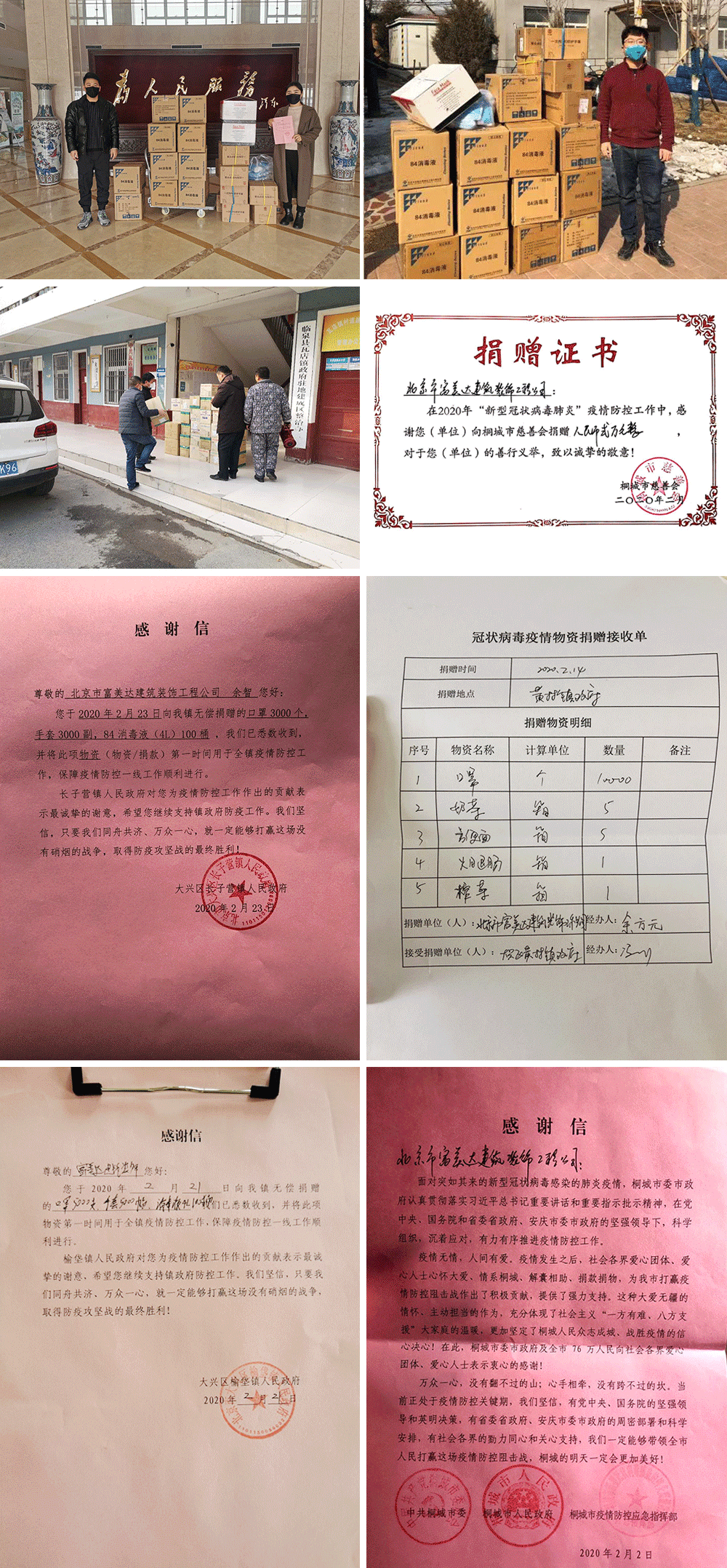 越是危難時(shí)刻,越顯責(zé)任擔(dān)當(dāng),越到艱難險(xiǎn)阻,越顯人間大愛,在沒有硝煙的戰(zhàn)場(chǎng)上,富美達(dá)正在行動(dòng)。作為大興區(qū)區(qū)內(nèi)重點(diǎn)企業(yè),抗擊疫情我們義不容辭,單位領(lǐng)導(dǎo)第一時(shí)間發(fā)動(dòng)各方資源優(yōu)勢(shì),采購(gòu)抗疫緊缺物資,我們及時(shí)對(duì)大興區(qū)黃村鎮(zhèn)、大興區(qū)榆垡鎮(zhèn),大興區(qū)長(zhǎng)子營(yíng)鎮(zhèn),安徽省安慶市、桐城市、阜陽市、懷寧縣進(jìn)行了捐款捐物,總價(jià)值達(dá)到37萬元。